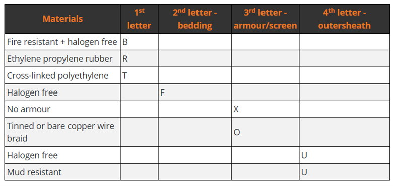 The following table is a guide to NEK 606 cable code designation